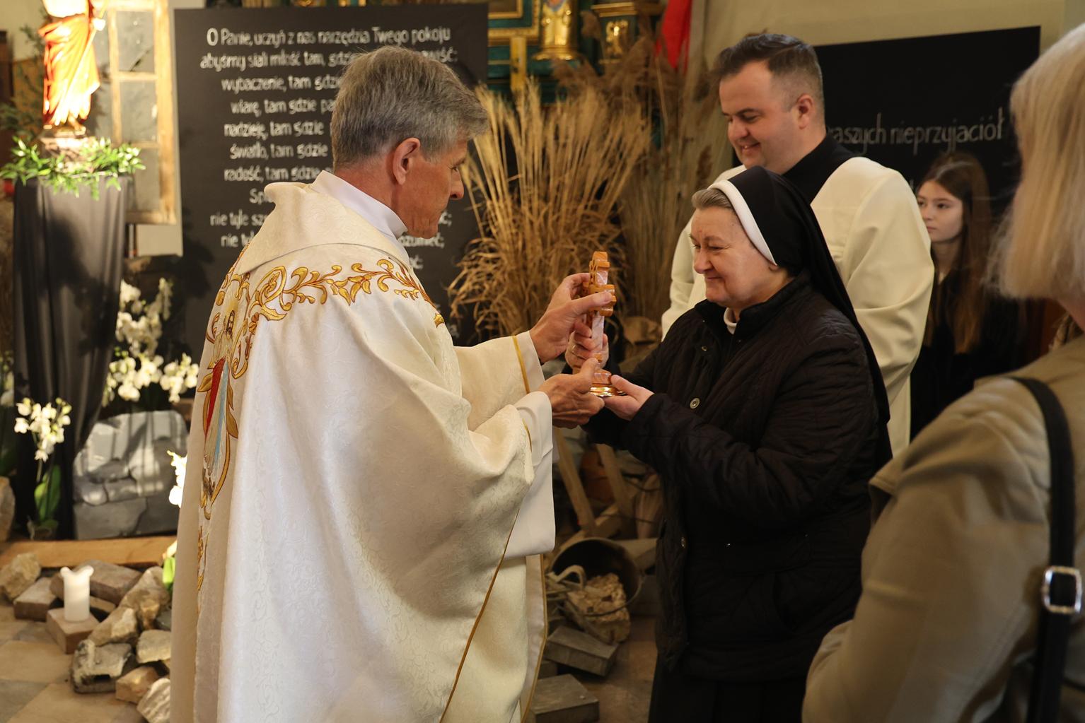 W Niedzielę Biblijną 19 kwietnia 2026 r. Parafia Brzeziny przyjęła relikwie Błogosławionych Sióstr Męczennic Warmińskich. Do świątyni wprowadziły je ich duchowe siostry ze Zgromadzenia św. Katarzyny Dziewicy i Męczennicy z Braniewa. W zeszłym roku w maju Kościół w Polsce cieszył się z beatyfikacji Sióstr Katarzynek. Relikwiarz dla Bł. Sióstr ufundowała osoba z Kowali. Po wprowadzeniu do kościoła został ustawiony na specjalnie przygotowanym ołtarzu. Jego dekorację stanowił krzyż z palmą - symbol męczeństwa oraz 15 czerwonych kwiatów - symbol zbyt wcześnie ściętego życia. Ołtarzyk nawiązywał do tegorocznego wystroju Grobu Pańskiego w Brzezinach, który przypominał ewangeliczną radę "Miłujcie swoich nieprzyjaciół i módlcie się za tych, którzy was prześladują" oraz zachęcał do modlitwy o pokój, słowami św. Franciszka z Asyżu. Ofiarę i misję Błogosławionych Męczennic przybliżyła podczas Eucharystii s. Róża Rusak CSC, mówiła - "Kochani jesteście w tej przepięknej świątyni otoczeni chwałą wszystkich Świętych. A dzisiaj chciałbym, żebyście do tego grona wzięli też nasze Błogosławione Męczennice, s. Krzysztofę i jej XIV Towarzyszek. To są ofiary II wojny światowej. To są ofiary męczeństwa Armii Czerwonej, która wkraczając na tereny Mazur, Powiśla, Pomorza miała taki przykaz 'zniszczcie wszystko, co napotkacie na drodze'. I tak ta armia czyniła. Kiedy 21 na 22 stycznia 1945 r. wkroczyła do Olsztyna, była mroźna wtedy zima. Zaczęło się plądrowanie, gwałty, kradzieże. W szpitalu (dawniej mariackim, obecnie Szpitalu Miejskim) pracowały nasze siostry. Pierwszą ofiarą była s. Krzysztofa, która do końca była przy chorych. Zresztą wszystkie siostry powiedziały tak 'Zostajemy do końca'. Chociaż miały wybór, bo każdy z nas ma jakiś wybór. Mogły uciekać, bo ludność uciekała z tamtych terenów, wiedząc, słysząc, doświadczając jak wielkie okrucieństwo niesie za sobą Armia Czerwona. One zostały do końca. Przypłaciły to śmiercią męczeńską. (...) W czasie wojny zginęło 105 naszych sióstr. Najmłodsza miała tylko 27 lat, najstarsza 65. I choć wojna się skończyła nasze siostry ginęły jeszcze w czerwcu, sierpniu, a ostatnia z nich, w nasze patronalne święto, 25 listopada. To była s. Ksaweria. (...) My dziś wyjedziemy do Braniewa, ale prosimy Was, niech te Siostry zostaną w zacnym gronie wszystkich Świętych. Weźcie chociaż jedną z tych Sióstr do swoich domów, do swoich serc, a zobaczycie, że nie będziecie zawstydzeni, bo one już przynoszą owoce swojej modlitwy wstawienniczej." Po każdej Mszy Świętej wierni mogli za dowolną ofiarę nabyć różne pamiątki i dewocjonalia związane z Błogosławionymi i Zgromadzeniem Sióstr Św. Katarzyny. Parafianie bardzo chętnie rozmawiali i przekazywali intencje modlitewne przybyłym siostrom katarzynkom: s. M. Róży, s. M. Violetcie i s. M. Katarzynie. Błogosławione Męczennice: s. Krzysztofo, s. Liberio, s. Maurycjo, s. Leonis, s. Tiburcjo, s. Sekundino, s. Adelgardo, s. Aniceto, s. Gebhardo, s. Sabinello, s. Bono, s. Gunhild, s. Rolando, s. Caritino i s. Ksawerio – módlcie się za nami!