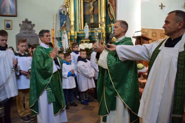Dnia 11 listopada 2018 roku, w 100-lecie odzyskania przez Polskę niepodległości do kościoła w Brzezinach zostały wprowadzone relikwie św. Stanisława Biskupa i Męczennika, Patrona Polski. Dokonał tego ks. prof. Stanisław Dyk. Relikwie umieszczone w posrebrzanym relikwiarzu, przedstawiającym patrona, ufundowanym przez rodzinę z Brzezin spoczął przed ołtarzem głównym wśród biało-czerwonej dekoracji z róż. Oprawę liturgii przygotowała schola parafialna oraz uczniowie SP w Brzezinach. W trakcie homilii ks. Stanisław Dyk przypominał, by nie bać się otworzyć na Boga i dążyć do świętości, bo każdy z nas jest do niej powołany. Zachęcał by prosić nowego patrona o moc w wychowywaniu i przekazywaniu Ewangelii kolejnym pokoleniom. Uroczysta eucharystia zakończyła się ucałowaniem relikwii św. Stanisława ze Szczepanowa. Święty Stanisław był biskupem krakowskim zatroskanym o dobro wiernych i Ojczyzny. 11 kwietnia 1079 został zamordowany przez króla Bolesława Śmiałego. Legenda mówi, że jego ciała strzegły orły, wspomina też o cudownym zrośnięciu się porąbanych części ciała, co miało symbolizować zjednoczenie podzielonej na dzielnice Polski. Św. Stanisław uczy nas jedności i ofiarności, gotowości oddania życia za słuszną sprawę, w obronie człowieka i wartości moralnych, stanowiących.