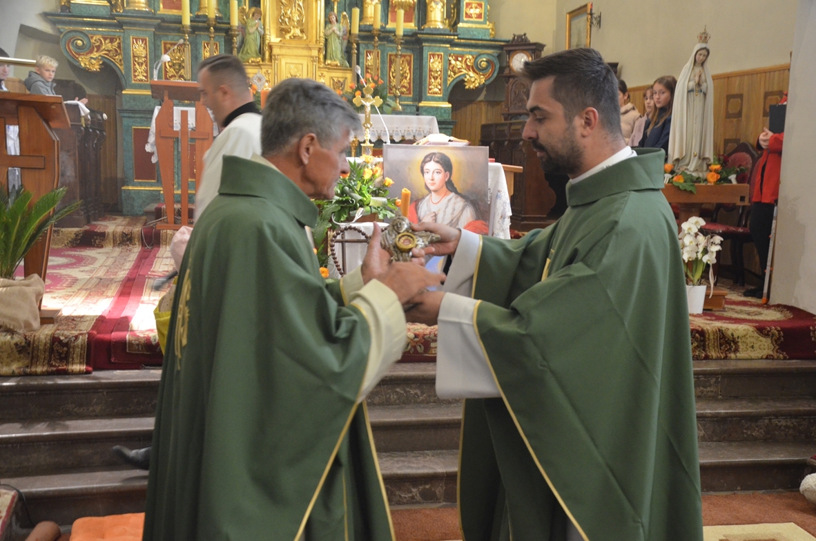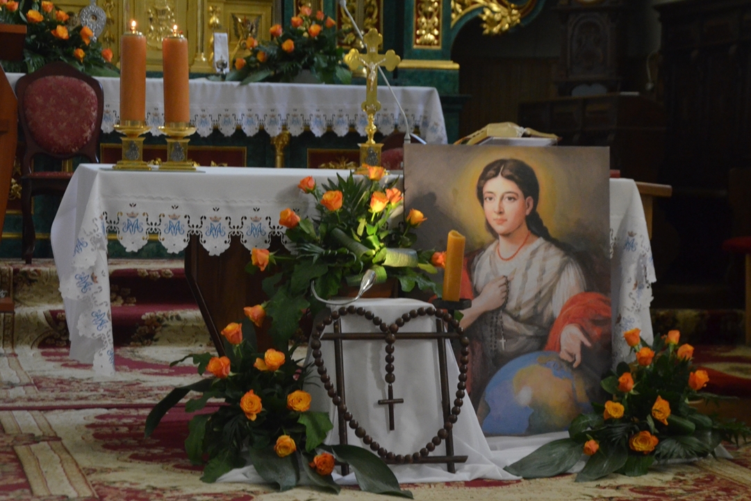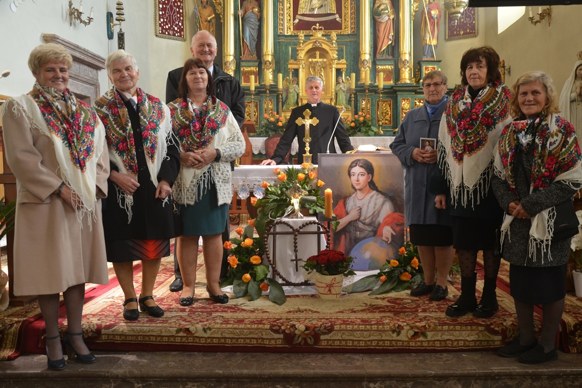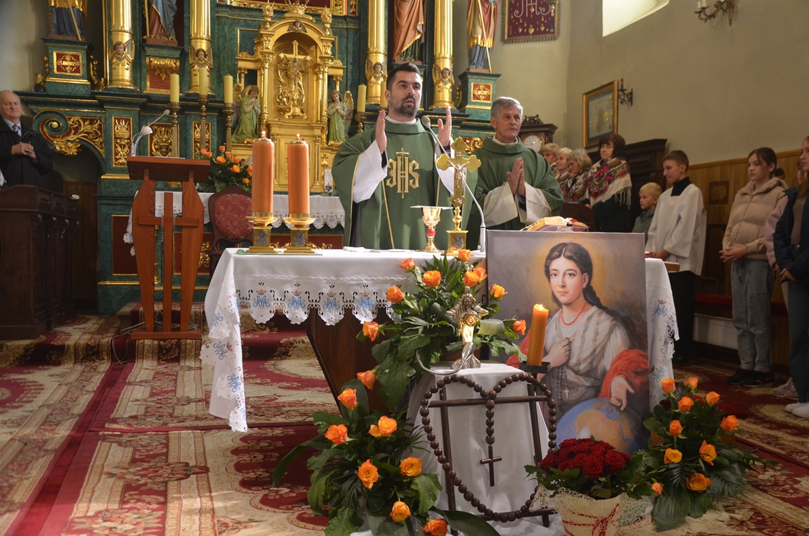 Niedziela Misyjna 20 października 2024 r. w parafii pw. Wszystkich Świętych w Brzezinach miała wyjątkowy charakter. W miesiącu różańcowym do kościoła zostały wprowadzone relikwie bł. Pauliny Jaricot, która wyjątkowo ukochała tą modlitwę. Uroczystości przewodniczył ks. Michał Kasprzyk. Relikwie nowej patronki zostały wprowadzone podczas Mszy Św. o godz. 10.00, w towarzystwie 9 zelatorów Żywego Różańca z parafii. Uroczystość poprzedziła dziewięciomiesięczna peregrynacja relikwii po domach wszystkich członków Kół Różańcowych. Oprawę niedzielnej Eucharystii przygotowali dzieci i młodzież z parafii. Relikwie bł. Pauliny zostały umieszczone w specjalnie zaprojektowanym relikwiarzu, który ufundowany został przez parafialne Koła Różańcowe. W trakcie uroczystości znajdował się wśród róż, na ołtarzyku z jej wizerunkiem. W takcie homilii, ks. Michał Kasprzyk odniósł się do Słowa Bożego z dnia i niedzieli misyjnej. Wprowadził tym do rozważania przesłania życia nowej patronki. Zachęcał, m.in.: „Kiedy dzisiaj jesteśmy świadkami tego jak bł. Paulina Jaricot dołącza do wielkiego zastępu świętych, którzy cześć odbierają w tej wspólnocie parafialnej, to gdybyśmy spojrzeli na ich relikwie, tu obecne między nami, to żywoty ich, choć tak różne, mają jeden wspólny mianownik. I do tego śmiało dołącza życiorys błogosławionej Pauliny. Można to streścić jednym zdaniem: Nic nad Boga. (…) Trzeba, żebyśmy zapytali siebie patrząc na życie bł. Pauliny Jaricot, naszych świętych patronów i tych świętych, którzy cześć odbierają w tej brzezińskiej świątyni - jak wygląda to nasze życie? Jak wiele w tym życiu naszym jest z Boga, a jak wiele jeszcze nam brakuje. Czy rzeczywiście my, tak jak bł. Paulina Jaricot i wszyscy święci Pańscy, żyjemy przeświadczeniem, że nic nie może być dla nas ważniejsze niż sam Pan Bóg.” Ks. Michał przybliżając kolejne elementy życiorysu bł. Pauliny, zachęcał - "Patrząc na tę, która dziś staję w tej wspólnocie parafialnej i pragnie z Wami pozostać, wpatrując się w jej życie, też pełne problemów i trudności, zauważmy, że nie było to życie jakiejś superbohaterki, że to życie nie różniło się za bardzo niż to nasze, moje i twoje. Trzeba, żebyśmy tak jak ona i wszyscy święci wybierali zawsze dobro, stawali po Bożej stronie, żebyśmy w tych naszych codziennych decyzjach, zostając przy tym co prawdziwie Boże, co się wiąże z dążeniem do świętości, pokazywali innym, niczym bł. Paulina, że da się żyć Ewangelią w środowisku, w którym się jest na co dzień. Że jest to w zasięgu mojej ręki." Niech nowa Patronka razem z Matką Bożą, Królową Wszystkich Świętych wypraszają nam potrzebne łaski i towarzyszą nam w drodze do nieba, pełnej radości, światła, boleści i chwały.