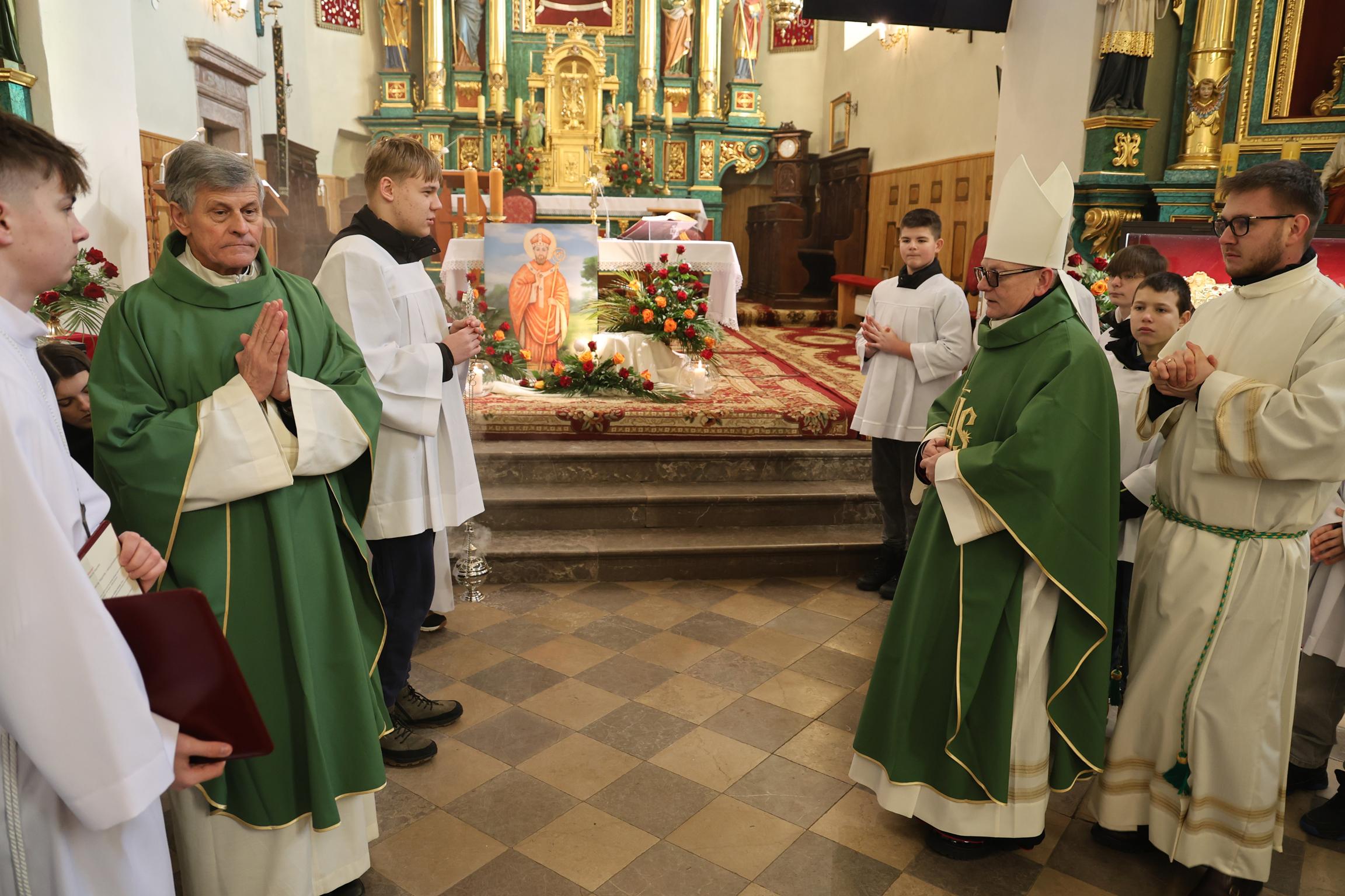 Wierność Bogu w posłudze arcybiskupiej, opieka nad ubogimi oraz pustelnicza samotność to cechy, które charakteryzowały postać świętego Bogumiła z Dobrowa, którego relikwie zostały wprowadzone do Parafii Brzeziny. Uroczystość odbyła się w pierwszą niedzielę miesiąca 1 lutego 2026 r. Przewodniczył jej ks. infułat Andrzej Ziemieśkiewicz, proboszcz, dziekan i prepozyt Kapituły Uniejowskiej z Diecezji Włocławskiej. Posrebrzany relikwiarz świętemu Bogumiłowi ufundowała rodzina z Nidy. Oprawę liturgii przygotowała młodzież z parafii. Dla wiernych przybyłych na Eucharystie przygotowano pamiątkowy obrazek z wizerunkiem i modlitwą do nowego patrona. Podczas płomiennej homilii ksiądz infułat, jako kustosz relikwii świętego przybliżył jego żywot i ciągły kult w Uniejowie: „Nasz święty patron Bogumił, daleki patron, bo przecież żył w XII wieku. Możemy powiedzieć – cóż on może dla nas zrobić? Powiem, że mocny patron. Przyjeżdża wielu pielgrzymów, a nawet grupa egzorcystów z Polski poprosiła o jego relikwie. (…) Święty Bogumił jest niesamowity. Modlę się do niego w wielu trudnych sprawach – i wiecie, że on pomaga, że on działa. Żył w XII wieku, jak mówiłem. Był arcybiskupem gnieźnieńskim, ale w Uniejowie jest również zamek, który był letnią rezydencją arcybiskupów gnieźnieńskich, dlatego bywał w Uniejowie. Potem postanawia, że rezygnuje z tego wszystkiego, co jest w tytule arcybiskup, biskup. Jedzie do Rzymu, do papieża i składa rezygnację. Wraca do nas, i niedaleko Uniejowa w miejscowości Dobrów, zamieszkuje na pustelni, w takiej ziemiance. I w ciągu roku zauważono, że do niego ciągną tłumy ludzi, bo on się z nimi modli. Nazywany jest cudotwórcą. (…) Dobry jest ten Bogumił, a samo słowo Bogu-mił: miły Bogu. Zdobywał wykształcenie i w Paryżu i w Rzymie. Świetnie wykształcony, a jednak zostaje pustelnikiem. Święty na te czasy, pokazujący nam, że trzeba w życiu szukać miejsc, w których można odnaleźć Boga.” Uroczysta Eucharystia była sprawowana w intencji żywych i zmarłych osób konsekrowanych pochodzących z parafii Brzeziny. Niech święty Bogumił wyprasza opiekę Opatrzności Bożej i wytrwałość w drodze do Nieba.